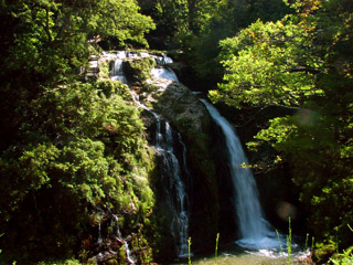 山奥の温泉街のどん詰まり、川沿いの細い遊歩道をたどっていくと、ちょっと不似合いなほど堂々とした瀑布に行きあたります。